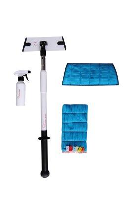 1 manche télescopique ergonomique de 66 à 101cm, 1 support Velcro 25cm, 1 bandeau vitre, 1 gant vitre et un pulvérisateur. Idéal pour le nettoyage des vitres et miroirs.
