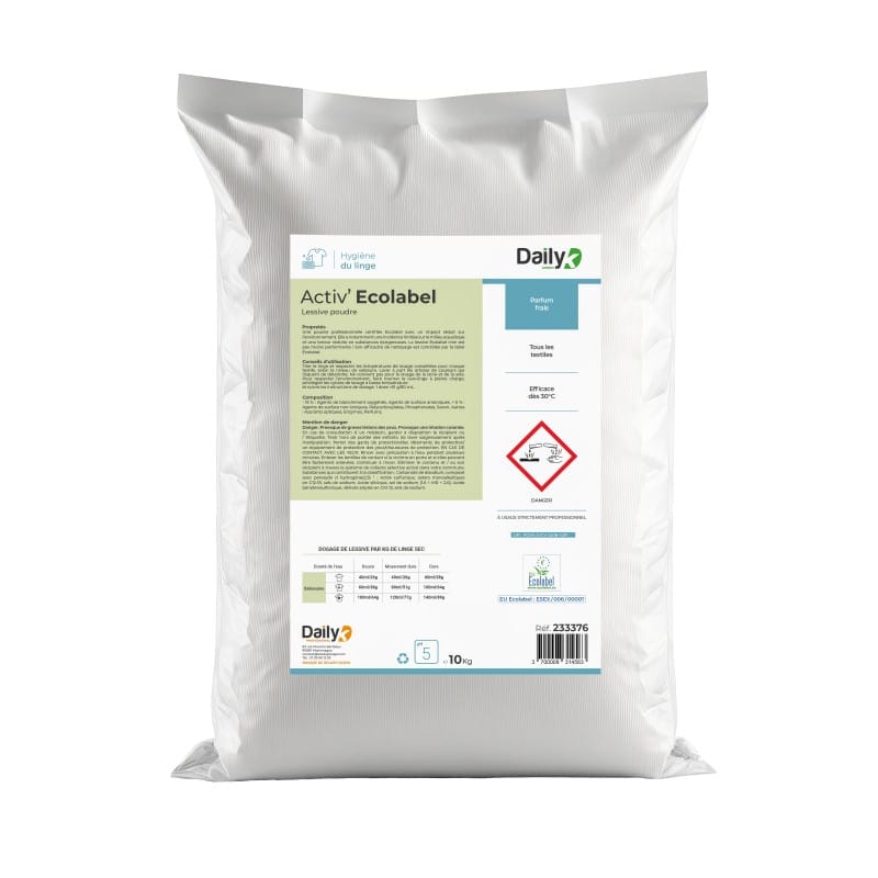 Cette lessive en poudre professionnelle est certifiée Ecolabel et a donc un impact réduit sur l’environnement. Elle a notamment une incidence limitée sur le milieu aquatique et une teneur réduite en substances dangereuses. La lessive Ecolabel n’en est pas moins performante ! Son efficacité de nettoyage est contrôlée par le label Ecolabel.