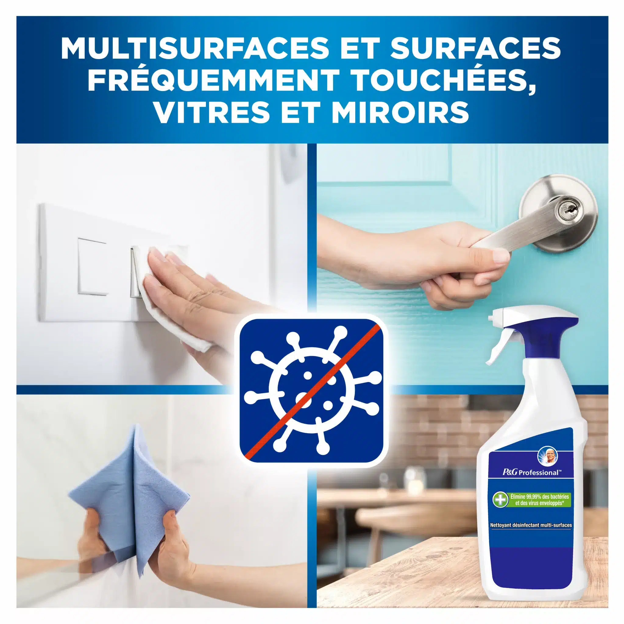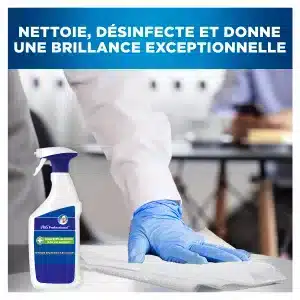 PROCTER & GAMBLE PROFESSIONAL NETTOYANT MULTI-SURFACES VITRES & INOX 750ML est un spray prêt à l’emploi qui offre une désinfection efficace des surfaces, y compris en inox et vitrées. Avec une formule approuvée pour le contact alimentaire et labellisée HACCP, ce nettoyant garantit un large spectre de désinfection, agissant sur les virus enveloppés, y compris le SARS-CoV 2. En éliminant 99,99% des coronavirus et des bactéries, il assure une hygiène optimale en seulement 15 secondes de contact. Ce produit polyvalent nettoie en profondeur tout en laissant les surfaces étincelantes sans laisser de traces, offrant ainsi un résultat impeccable sur diverses surfaces. Optez pour le NETTOYANT MULTI-SURFACES VITRES & INOX pour une propreté totale et une désinfection rapide, certifiée et approuvée pour des performances haut de gamme.